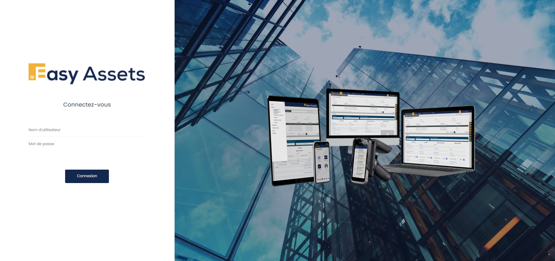Pour accéder à EASY ASSETS, vous n'avez besoin que d'un navigateur Web et d'une connexion Intranet (si la solution est installée en interne), ou une Connexion Internet fonctionnelle (Si la solution est installée sur Cloud).