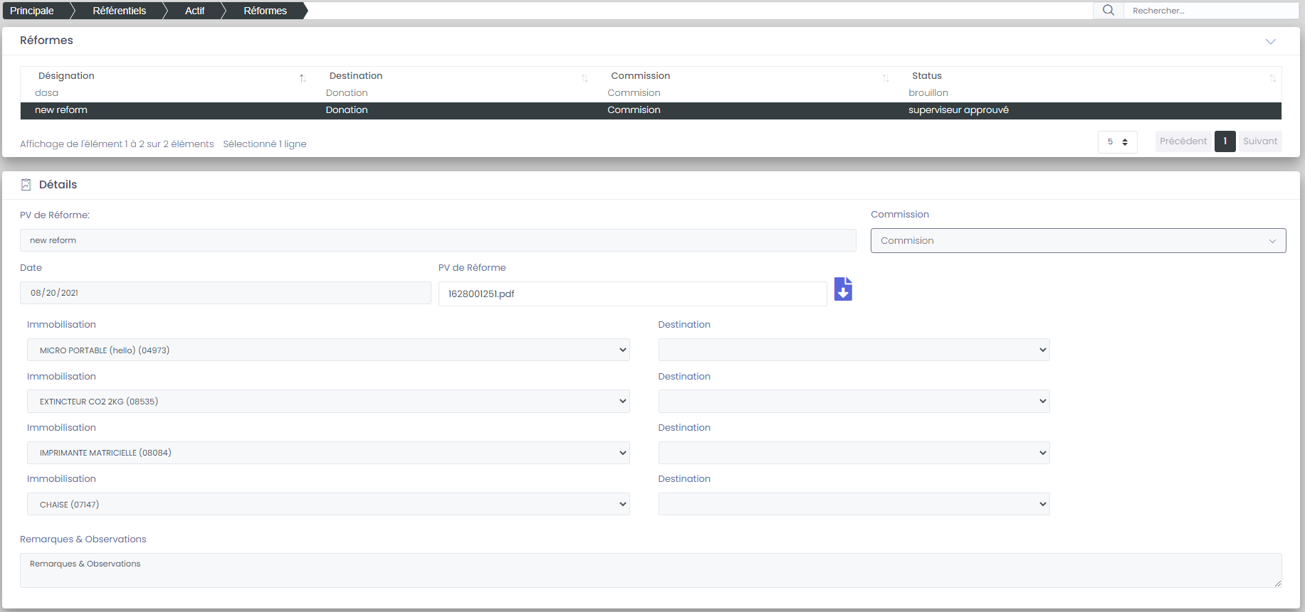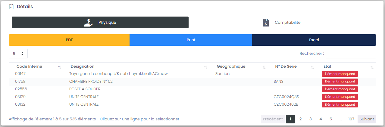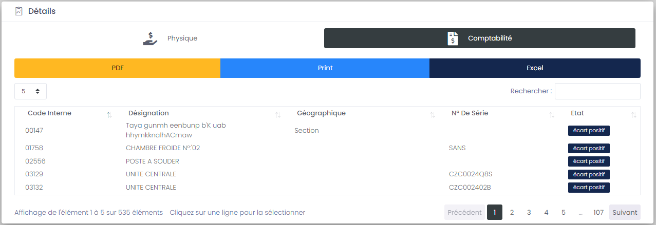 Sur cette partie, EASY ASSETS va faire un traitement automatique, pour comparer ce qui a été récupéré de l'application mobile, avec ce qu'il existe sur les fiches inventaires sur le système, et affiche les décalages (si trouvés)